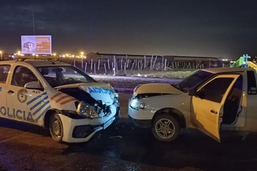 En la madrugada del domingo, alrededor de las 06:00 horas, un incidente vial se registró en la intersección de las calles Brigada IM N°1 y Soldado Desconocido. Un móvil policial que realizaba labores de prevención fue impactado de frente por un vehículo marca Volkswagen modelo Saveiro.